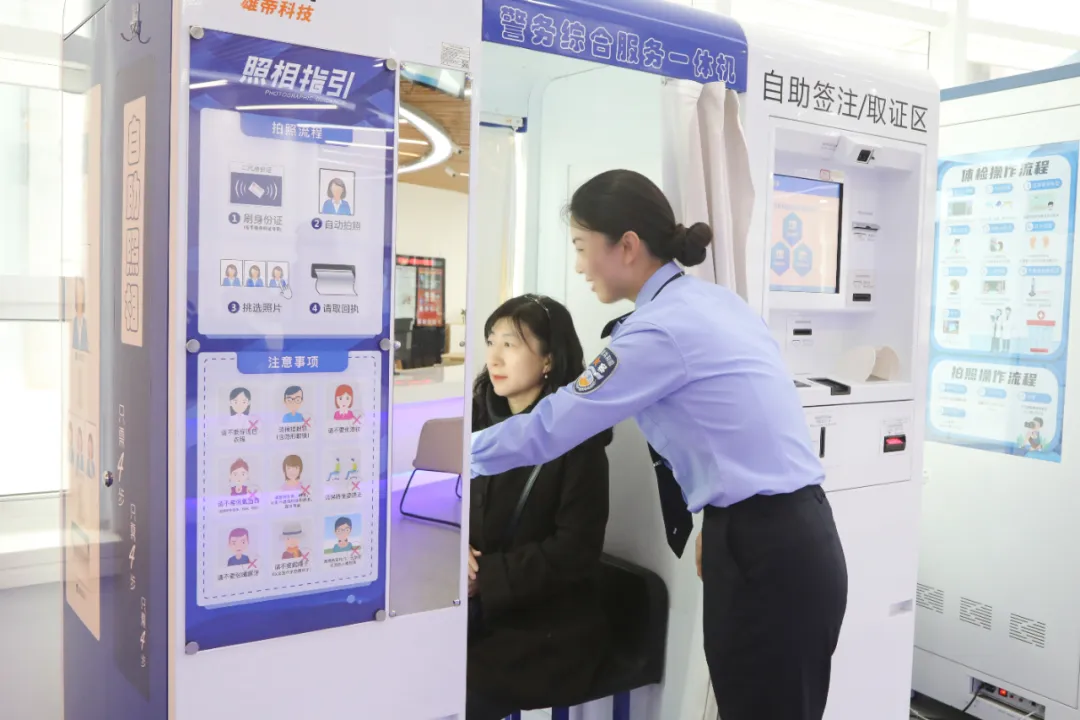 专区还设有自助服务区,配备自助人像采集设备、签注机、体检机及“三警合一”自助终端,群众可自助办理身份证等32项高频业务。针对老年人、儿童等人群自助操作能力较弱的情况,公安专区还贴心设置人工照相演示板,分别图示了办理各种业务时拍照的要求、姿势等规范操作流程,确保群众“只跑一次”。
