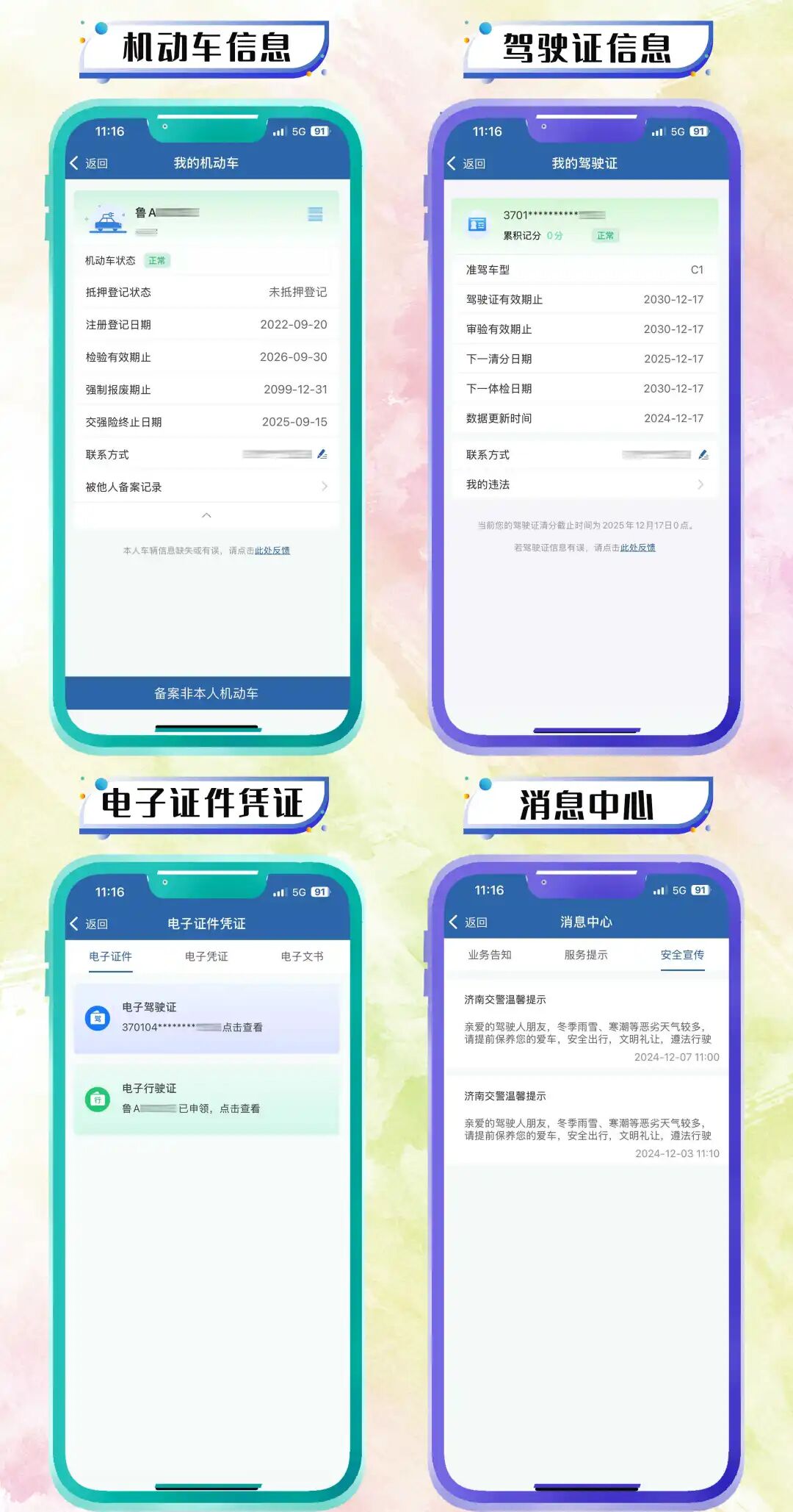 机动车、驾驶证、电子证件凭证及交通安全信息提醒等。